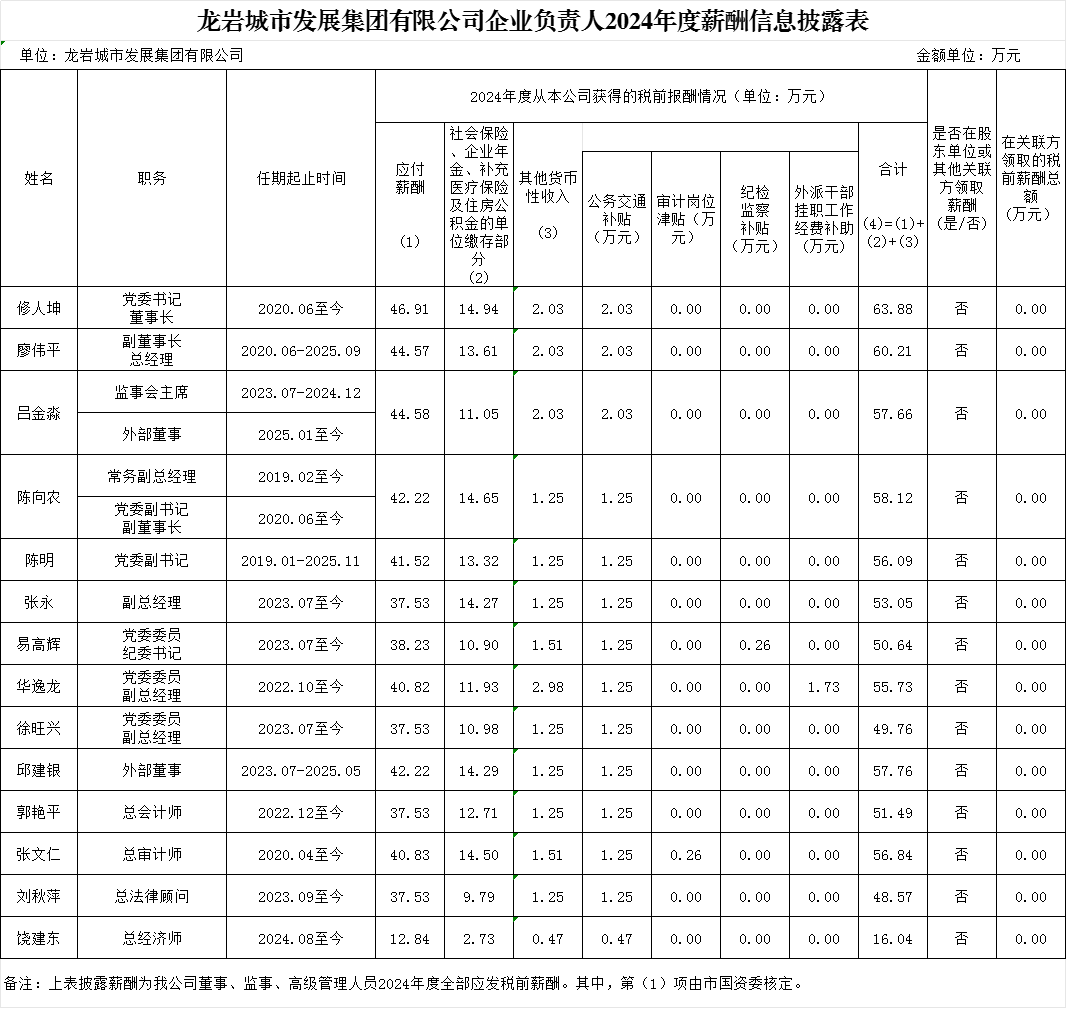 龍巖城市發(fā)展集團有限公司及所屬企業(yè)負責人2024年度薪酬、2022-2024年任期激勵收入信息披露表